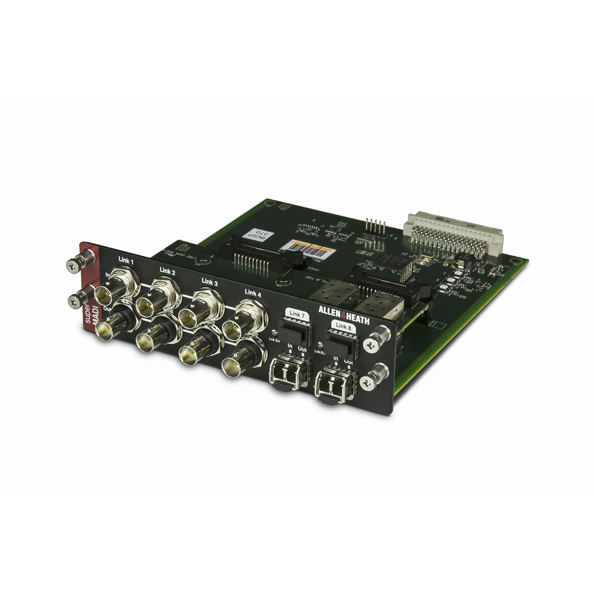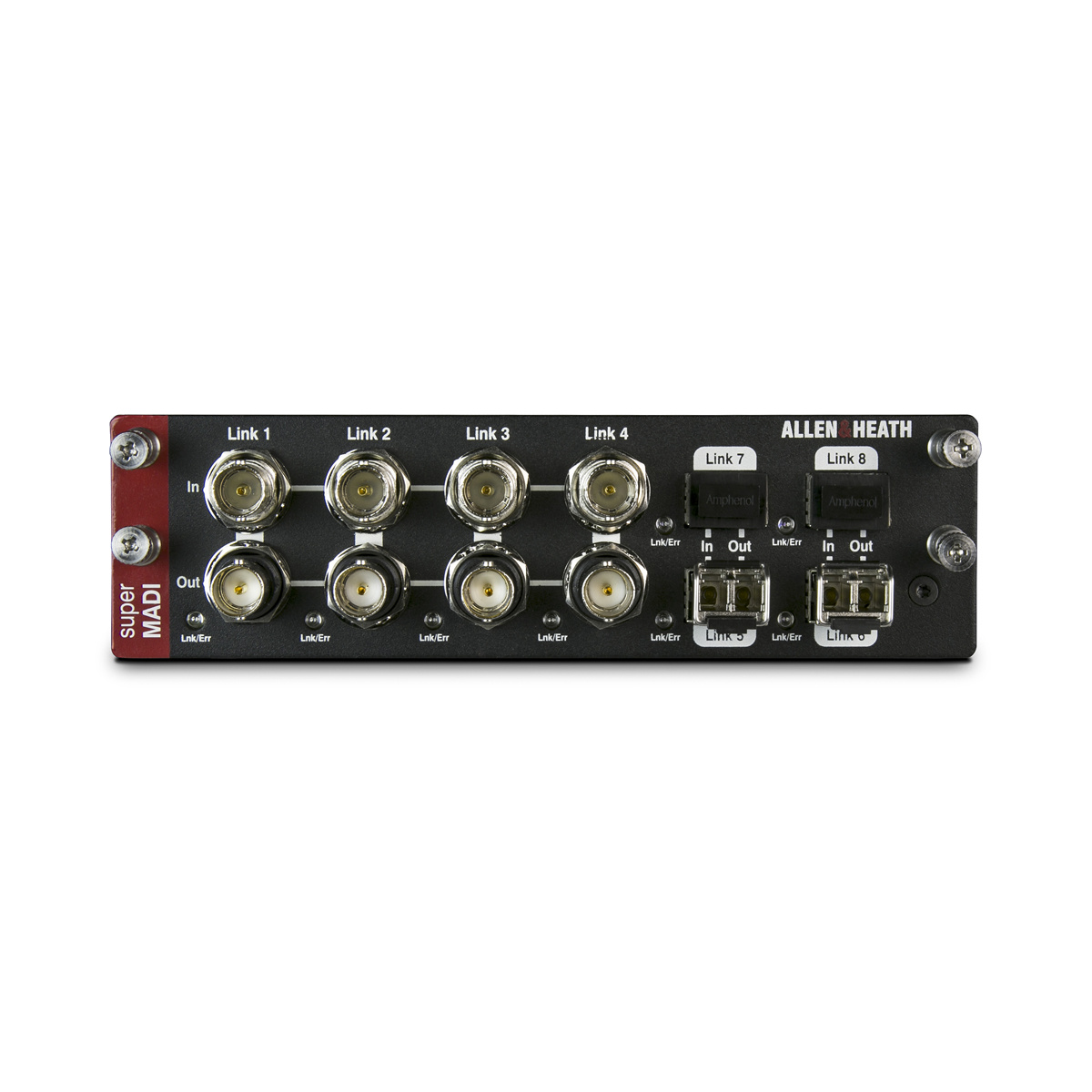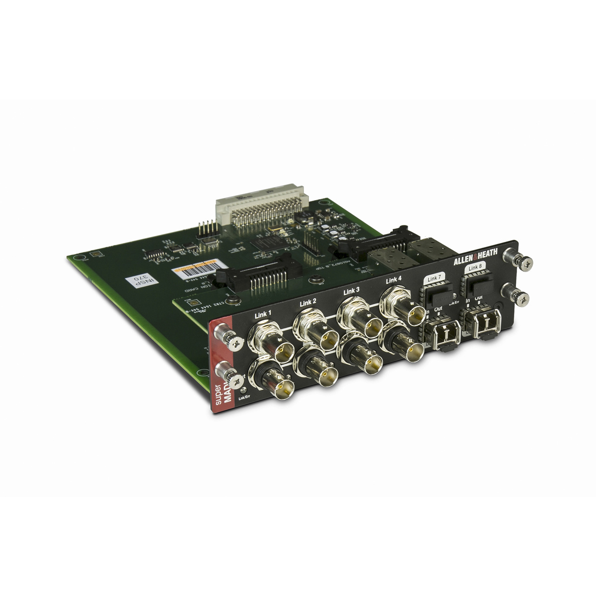 La tarjeta de red de audio superMADI (M-DL-SMADI-A) forma parte de una gama de opciones de red de audio que se pueden instalar en cualquier puerto de E/S dLive o Avantis de Allen & Heath. Diseñada para integrar dLive y Avantis en una amplia gama de escenarios de transmisión, interfaz en vivo y grabación, la tarjeta de interfaz superMADI ofrece numerosas opciones de conectividad, incluyendo ocho conectores BNC y cuatro ranuras SFP para transceptores de fibra óptica (no incluidos). Tanto el formato coaxial como el óptico ofrecen hasta 128 E/S a 96 kHz cada uno, y la redundancia y la frecuencia de muestreo se pueden conmutar por par de enlaces, con la opción de elegir entre el modo Smux de 96 kHz o el modo de alta velocidad. La tarjeta superMADI también puede ser utilizada por ingenieros y empresas de alquiler para conectarla a cualquier consola de terceros compatible con MADI, lo que permite la división digital de alto nivel de canal, por ejemplo, entre sala de sonido y monitores.