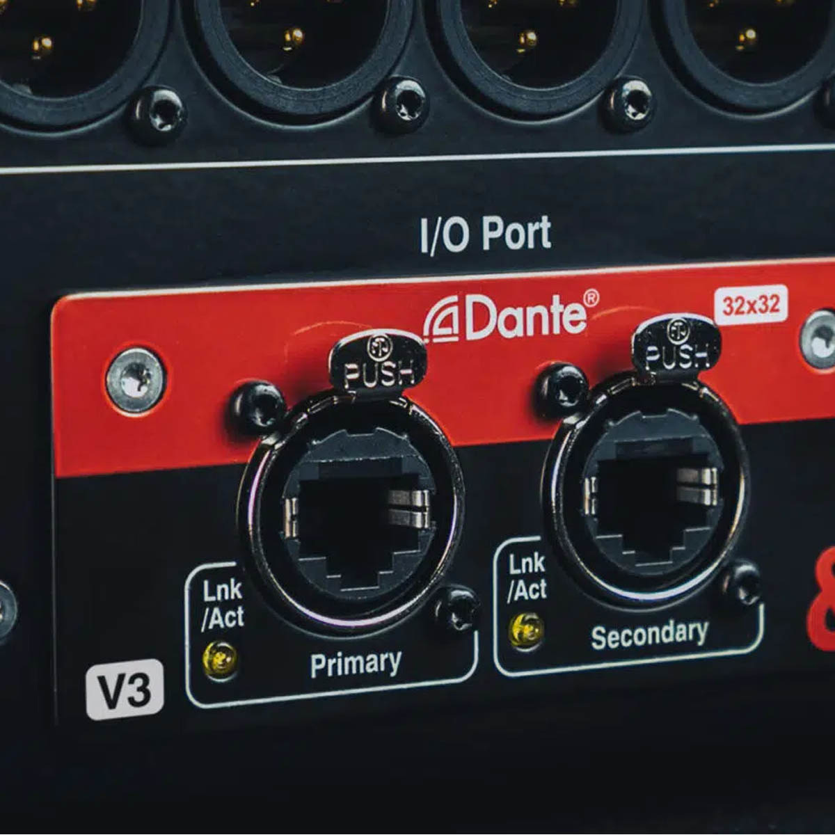 El SQ Dante 32×32 proporciona a cualquier mezclador SQ o procesador AHM una interfaz completa de 32×32 canales, 96 kHz o 48 kHz, a una red Dante.