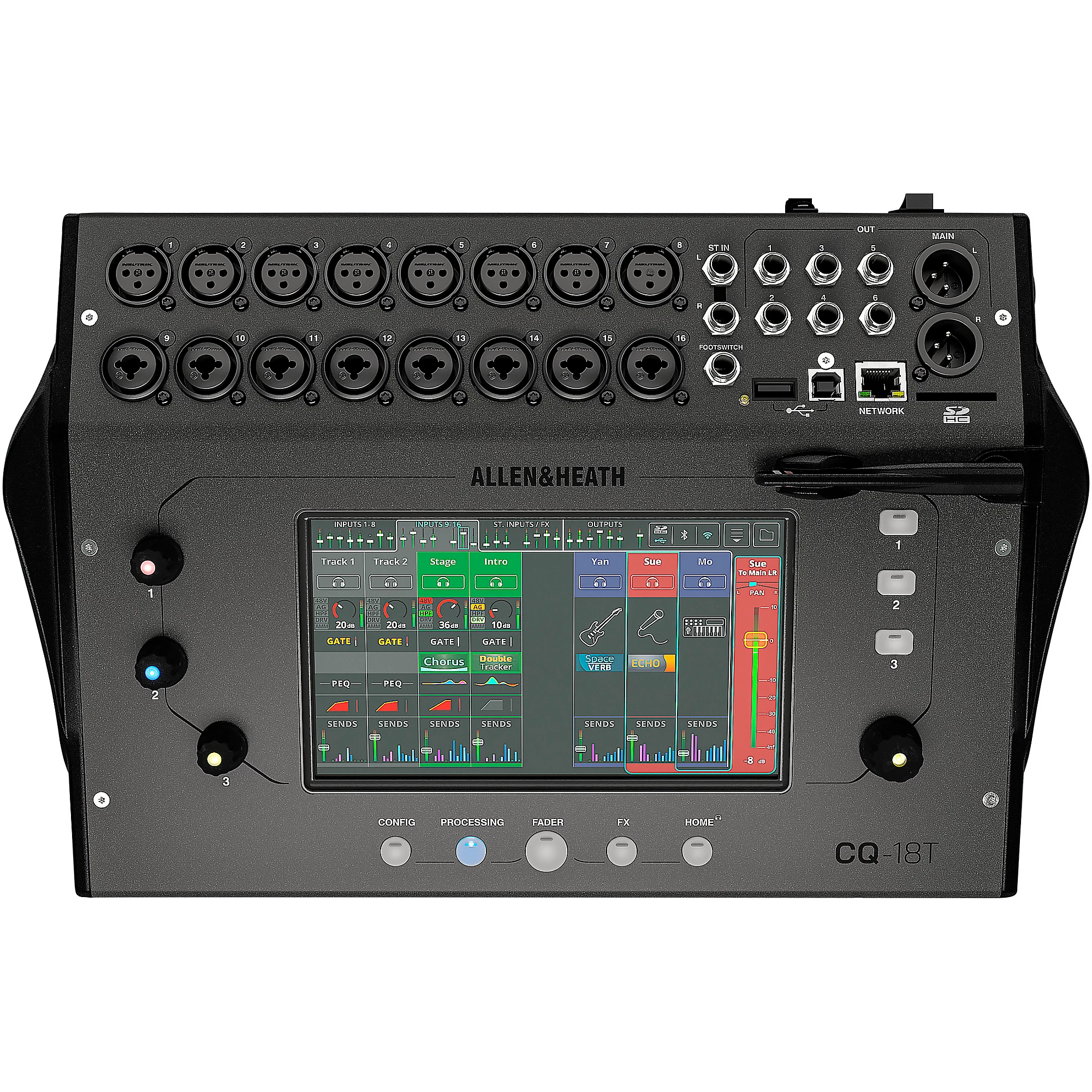 CQ-18T digital mixer with 7″ touchscreen, Wi-Fi, and Bluetooth connectivity. Specifications: