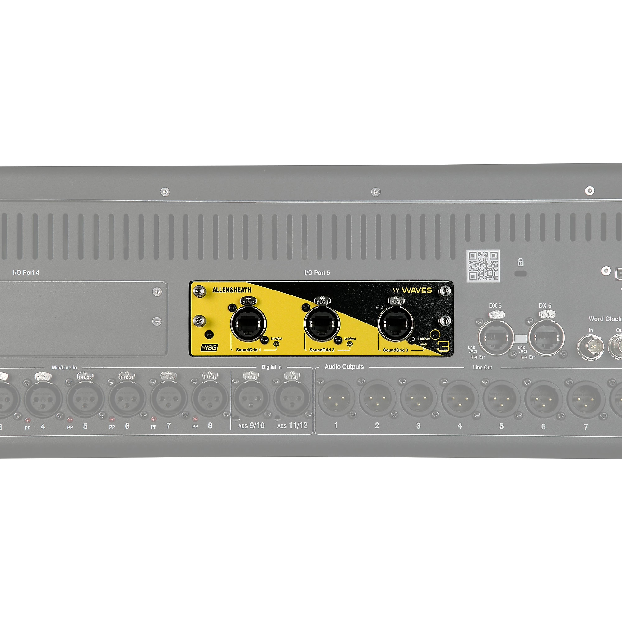The Waves V3 Audio Network Card (M-DL-WAVES3) is one of several audio networking options that can be connected to an Allen & Heath dLive I/O port. It provides a 128 x 128 channel interface at 48/96 kHz for the Waves SoundGrid network platform for various applications, such as Waves plugin processing, audio distribution, and digital microphone splitting. It also offers a convenient way to record 128 audio tracks at 96 kHz to a Windows or Mac computer over a single CAT cable.