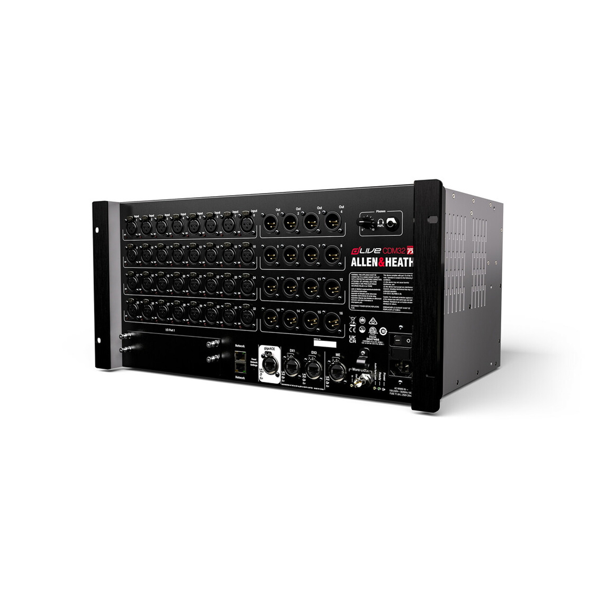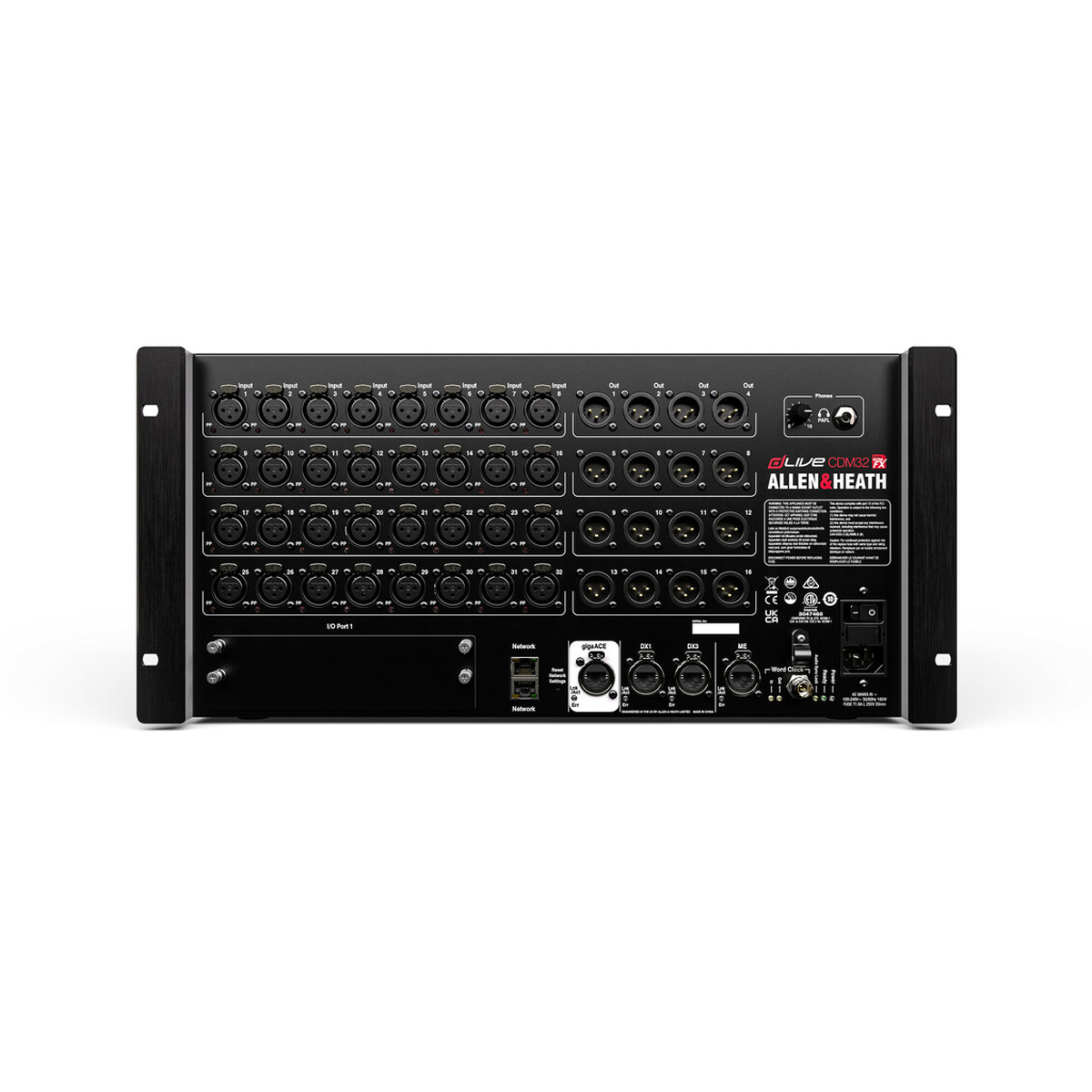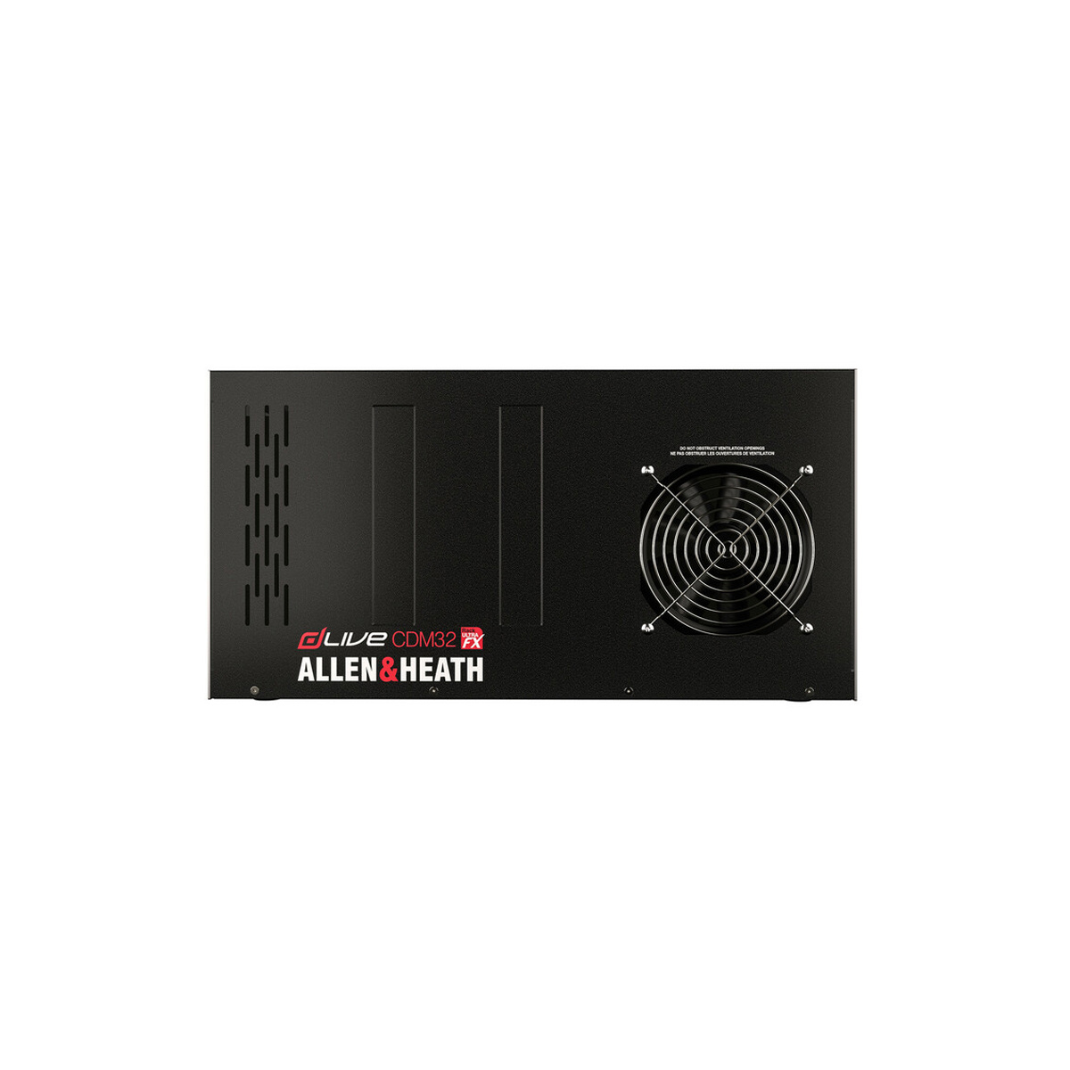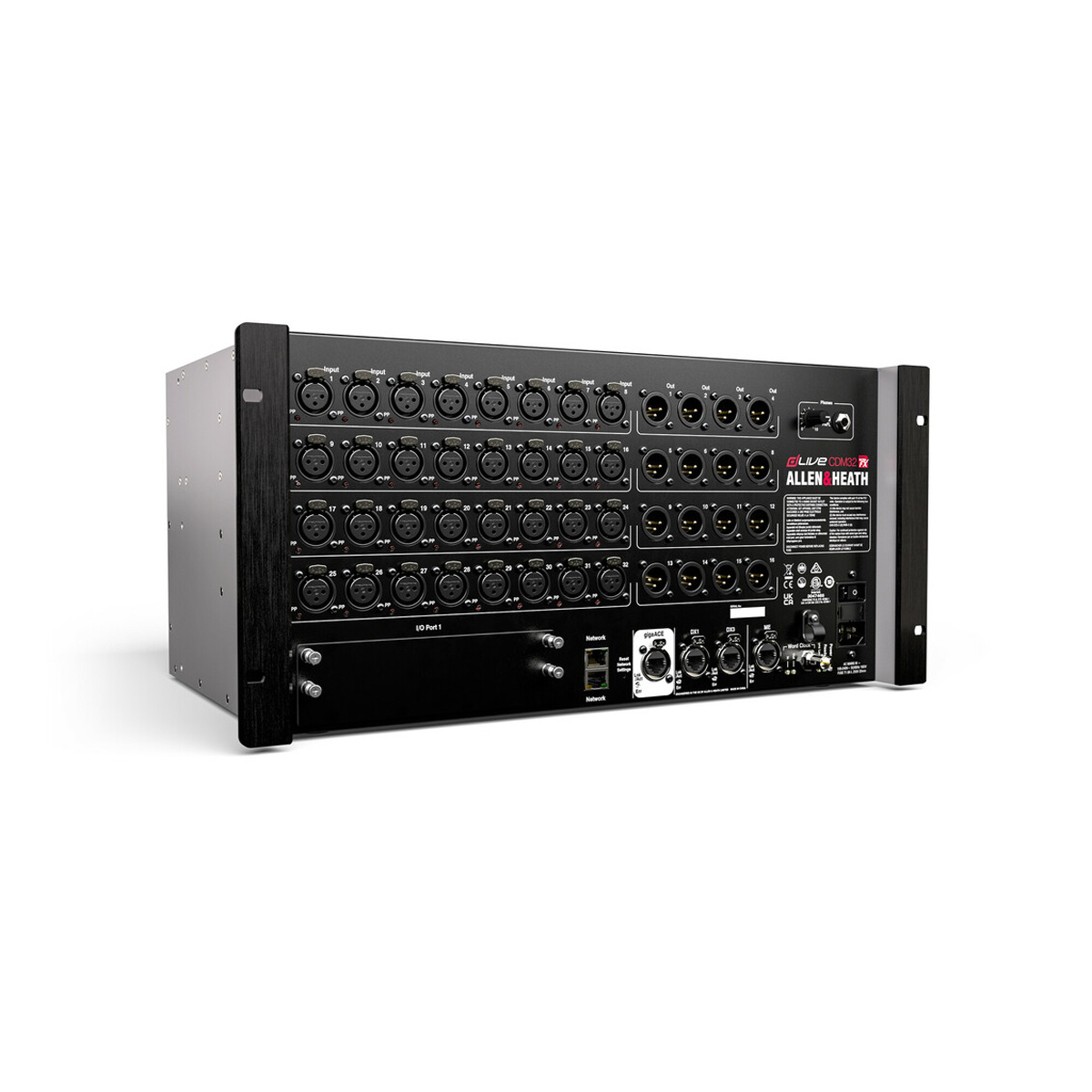 El MixRack es el corazón de cualquier sistema dLive. Alberga el procesamiento XCVI principal con E/S de audio, puertos de control y puertos de red de audio. Normalmente se conecta a una Surface dLive, pero también se puede controlar simultáneamente con o de forma independiente mediante una computadora portátil o iPad, controles remotos IP de Allen & Heath o controladores de terceros a través de TCP/IP.