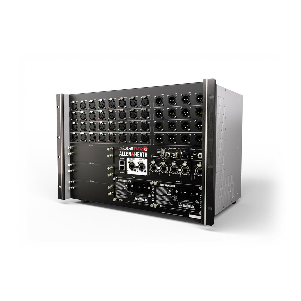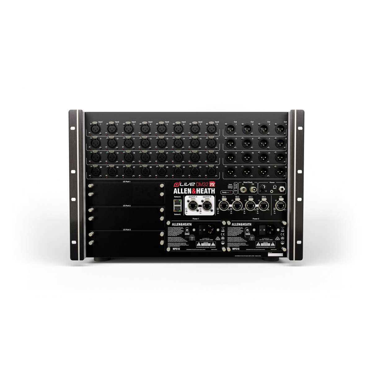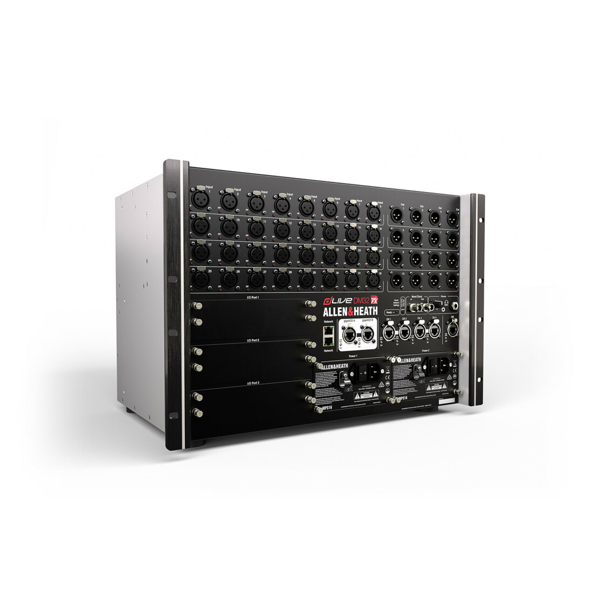 El MixRack es el corazón de cualquier sistema dLive. Alberga el procesamiento XCVI principal con E/S de audio, puertos de control y puertos de red de audio. Normalmente se conecta a una Surface dLive, pero también se puede controlar simultáneamente con o de forma independiente mediante una computadora portátil o iPad, controles remotos IP de Allen & Heath o controladores de terceros a través de TCP/IP.