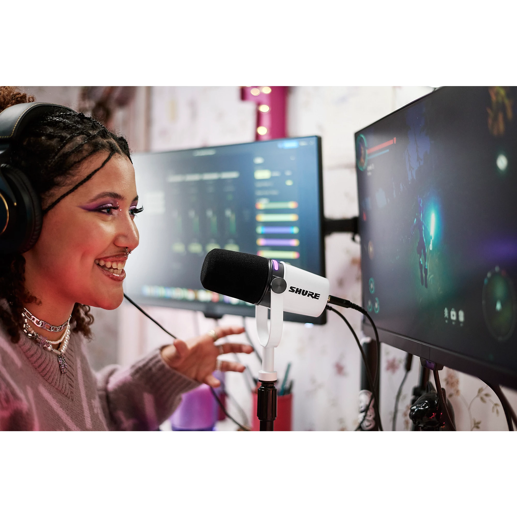 Want the best of both worlds? The Shure MV7+ makes high-quality audio easy, combining the rich warmth of a dynamic mic with the clear definition of a condenser. Whether you’re cutting vocals, hosting interviews or working on any kind of vocal performance, the MV7+ effortlessly captures your voice with detail and depth. User-friendly for creators at any level, you won’t need an engineering degree to nail professional sound with this mic. With hybrid USB and XLR connections, you can easily plug in and get right to work—anywhere from a casual recording spot to a fully-equipped studio. The MV7+ keeps distractions at bay, letting your voice take the lead.