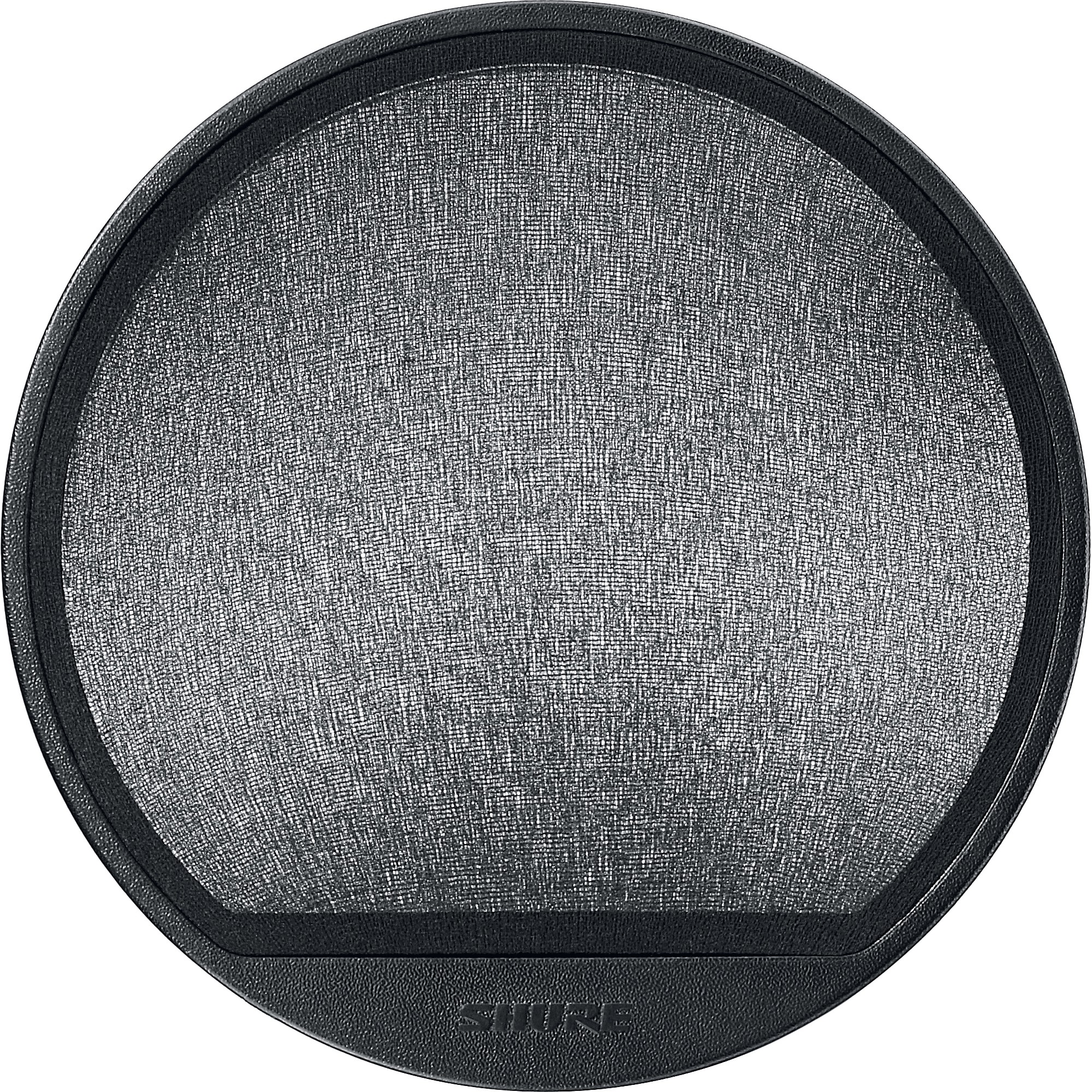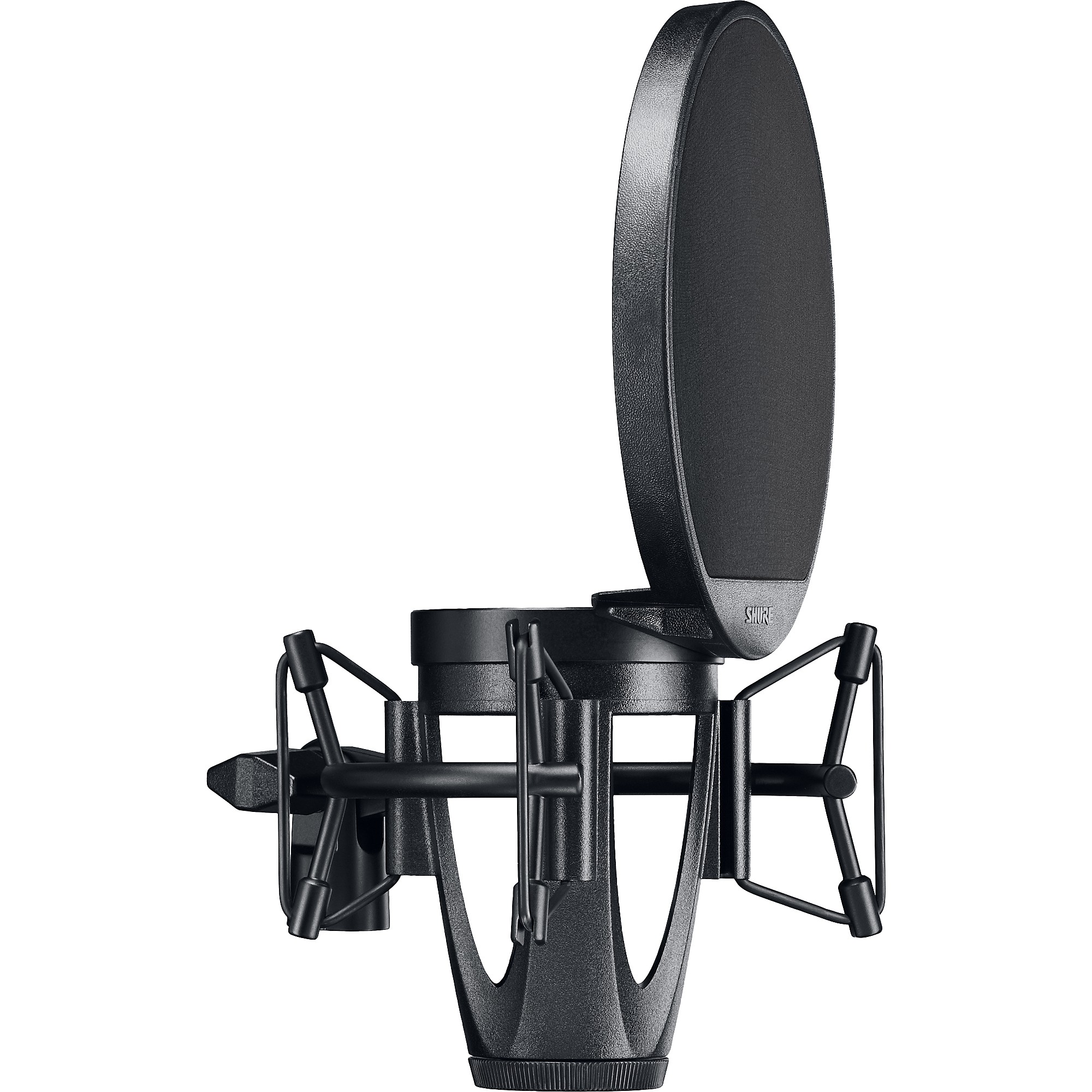 El soporte amortiguador de suspensión de goma ShureLock de jaula abierta con filtro antipop magnético Popper Stopper de perfil bajo crea un espacio natural entre el intérprete y el micrófono.